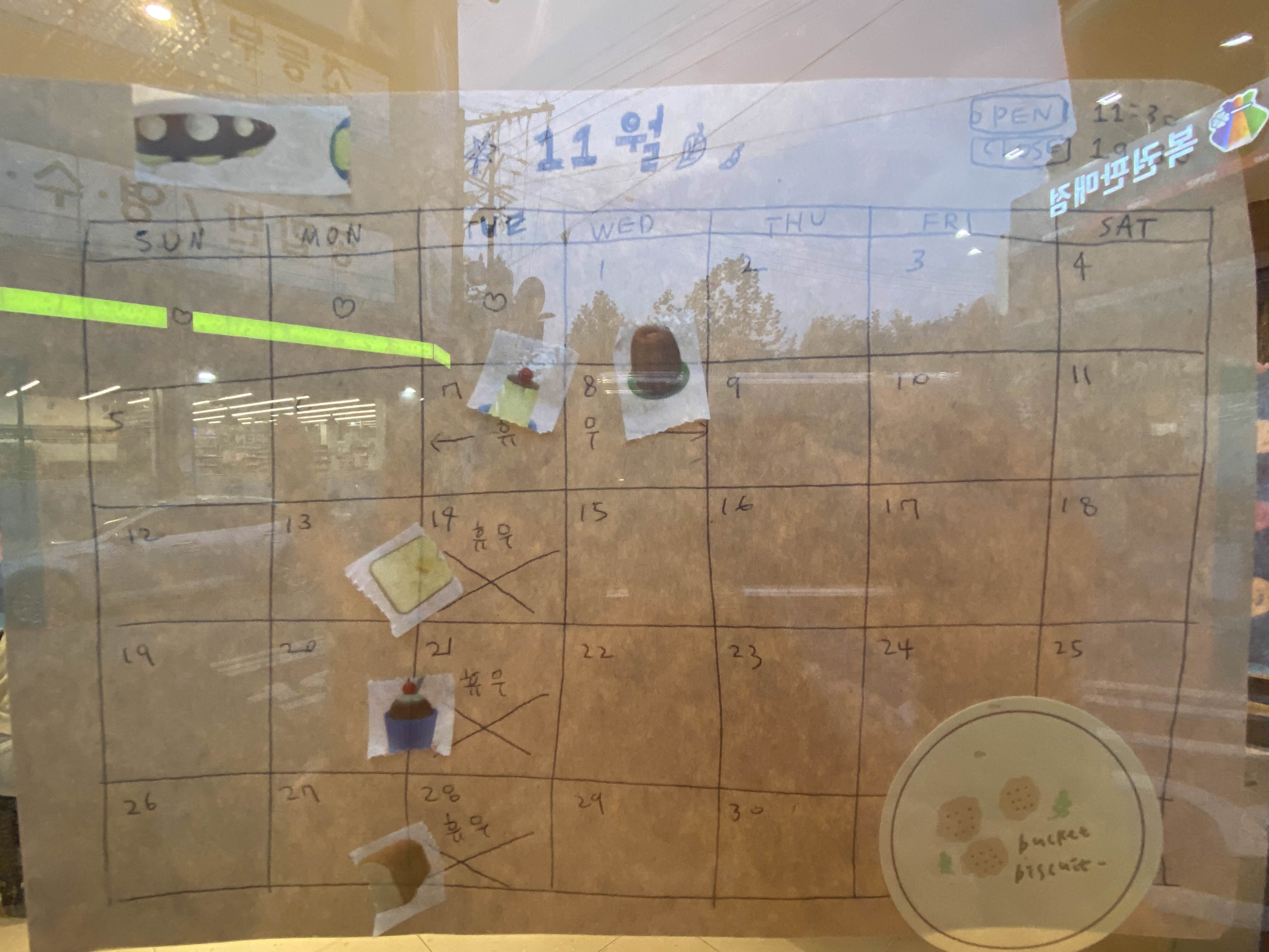 그 달의 휴무 일정은 입구에 있는 달력에 고지되어 있습니다.
